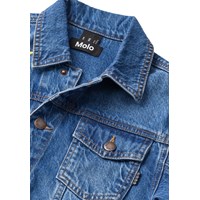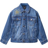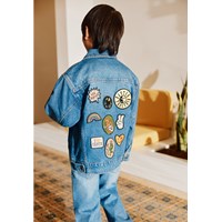 Blå denim jakke i bomuld med med farverige broderede patches på ryggen, der giver et unikt og personligt udtryk. Jakken har en løs pasform, skjortekrave, knaplukning fortil, lommer i siden, brystlommer samt justerbare trykknapper bagpå. Fra str. 92-134 leveres jakken med trykknapper, hvilket gør det lettere for børn at lukke jakken selv. Fra str. 140-176 leveres jakken med en almindelig knaplukning.