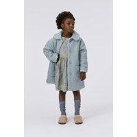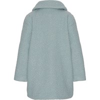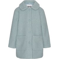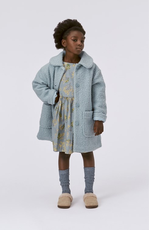 Lyseblå plysset frakke med store påsyede frontlommer, bred krave og knappelukning langs fronten.
