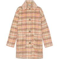 Ternet plysset frakke i rosa og beige nuancer og med store påsyede frontlommer, bred krave og knappelukning langs fronten.
