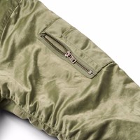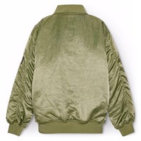 Klassisk grøn bomberjakke med ribkanter og praktiske lommer på fronten og ærmerne. Ærmerne har desuden ekstra vidde samt dekorative rynke-sømme bagtil langs hele ærmets længde. Indvendigt er jakken let foret med et orange quiltet for, der inkluderer en lille inderlomme med knaplukning. På brystet findes en aftagelig broderet tekst med ordene "Im Real.