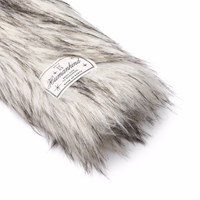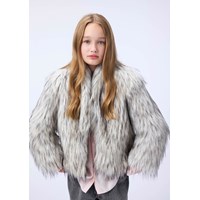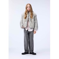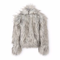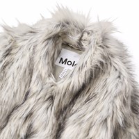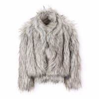 Faux fur jakke i grå og sorte farver med høj krave. Jakken har en normal pasfor, er hoftelang og lukkes med en stor hægte.