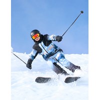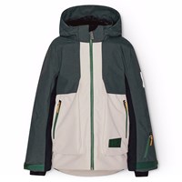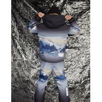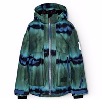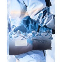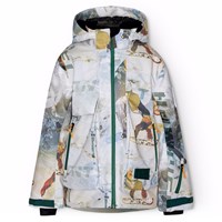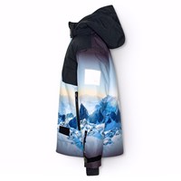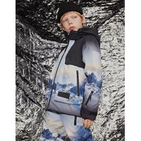 Vind- og vandtætte skijakke i genanvendt polyester, med et print af snedækket alper, solens skær og en klar på himmel. Jakken har en aftagelig foret hætte samt en vandtæt frontlynlås med overfald, der holder vinden ude. Jakken er udstyret med store reflekser, som sikrer synlighed i trafikken. Jakken har foret lynlåslommer, en lomme på ærmet til skikortet, samt en indvendig lomme. Jakken er udstyret med vindfang omkring hoften og i ærmeåbningen med hul til tommelfingeren, samt en regulerbar velcro, som sørger for at holde sne, vind og vand ude. Jakken er foret med fleece og 3M™ Thinsulate™, hvis lethed giver barnet en større bevægelighed uden at gå på kompromis med isoleringsevnen.