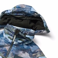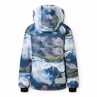 Vind- og vandtæt vinterjakke i genanvendt polyester, med et flot landskabsprint, der viser snedækkede bjergtoppe i klare farver. Jakken har en aftagelig foret hætte, praktisk lynlås lukning, lynlås lommer med fleece, ribkant ved håndleddene samt elastik i bunden som effektivt hjælper mod vind. Bagpå er der en stor refleks, som øger synligheden i trafikken. Ydermere er jakken foret med fleece, samt vatteret med 3M™ Thinsulate™.