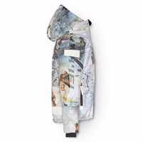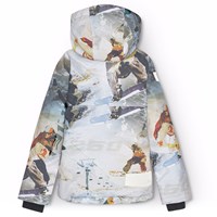 Vind- og vandtæt vinterjakke til en kold vinter i genanvendt polyester, med et pixeleret print af cool snowboarder i alperne. Jakken har en aftagelig foret hætte, lynlås med overfald, der holder sne, vind og vand ude. Jakken er udstyret med flere store reflekser, som sikrer synlighed i trafikken. Jakken har foret lynlåslommer samt en justerbar elastik i bunden sf jakken, for at holde varmen inde og vinden ude. Ærmerne er udstyret med ribkanter, der effektivt holder vind, sne og regn ude og samtidig sikrer, at vanterne forbliver på plads. Dragten er foret med 3M™ Thinsulate™, hvis lethed giver barnet en større bevægelighed.