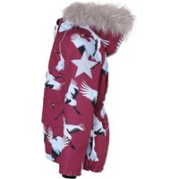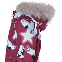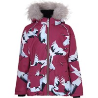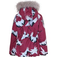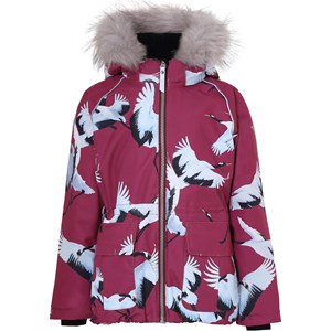 Cathy Fur er en vandtæt vinterjakke i bordeaux med print af flyvende traner. Jakken har aftagelig hætte med faux fur pelskant (som også kan tages af), lynlås ned langs fronten, rummelige lommer, justerbar, elastisk talje samt Molo's velkendte stjernerefleks bagpå. Jakken er lavet i et vindtæt, vandtæt og åndbart materiale, har 3M™ Thinsulate™ isolering, højkvalitetsfleece på udsatte områder og tapede sømme. Dette produkt har en vandafvisende PFC-fri imprægnering (indeholder f.eks. ikke PFOS, PFOA og lignende). Vandsøjletrykket og åndbarheden er yderligere forbedret og er nu helt oppe på 15.000 mm i vandsøjletryk og åndbarhed på 15.000 g/m2/24t.