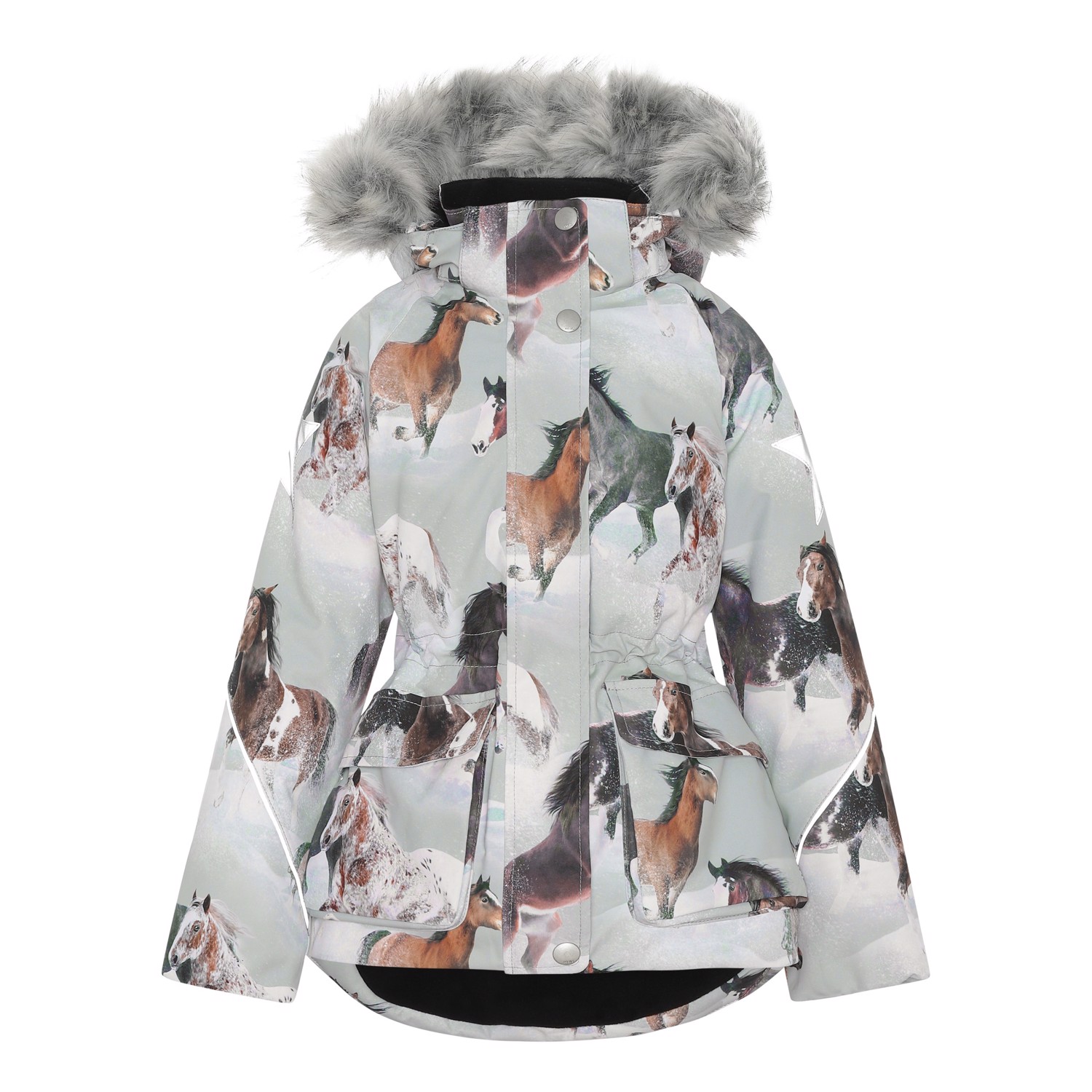 Cathy Fur er en vandtæt vinterjakke i lysegrå med heste print. Cathy Fur er perfekt både til de ekstrem kolde og almindelige vintre, grundet dets utrolig høje åndbarhed samt isolering. Den høje åndbarhed er med til at hjælpe kropstemperaturen regulere sig og sørge for, at dit barn hverken bliver for kold eller varm. På varmere vinterdage kan barnet derfor nøjes med tynde lag under og på dage med voldsomme tocifrede minusgrader kan man supplere med et ekstra lag indenunder. Har du er stillesiddende barn vil Cathy Fur også være et oplagt valg. Jakken har aftagelig hætte med faux fur pelskant (som også kan tages af), lynlås ned langs fronten, rummelige lommer, justerbar, elastisk talje samt Molo's velkendte stjernerefleks bagpå. Jakken er lavet i et vindtæt, vandtæt og åndbart materiale. Ydermaterialet er fremstillet af 45% recycled polyester, 3M™ Thinsulate™ foret er fremstillet af 78% recycled polyester og inderstoffet af 100% recycled polyester. Dette produkt har en vandafvisende PFC-fri imprægnering (indeholder f.eks. ikke PFOS, PFOA og lignende). Vandsøjletrykket og åndbarheden er yderligere forbedret og er nu helt oppe på 15.000 mm i vandsøjletryk og åndbarhed på 15.000 g/m2/24t.