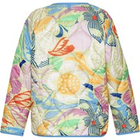 Quiltet, lysegul jakke med farverigt alloverprint af kunstneriske blad- og blomstersilhuetter. Jakken har lyseblå kantebånd og knaplukning. Der er anvendt en vand- og smudsafvisende coating uden brug af kemikalier som PFOS, PFOA og lignende.