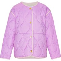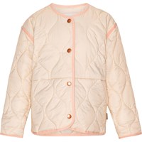 Quiltet, beige jakke med lyserødt kantebånd og knaplukning. Der er anvendt en vand- og smudsafvisende coating uden brug af kemikalier som PFOS, PFOA og lignende.