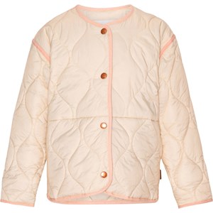 Quiltet, beige jakke med lyserødt kantebånd og knaplukning. Der er anvendt en vand- og smudsafvisende coating uden brug af kemikalier som PFOS, PFOA og lignende.