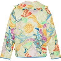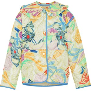 Quiltet, lysegul jakke med farverigt alloverprint af kunstneriske blad- og blomstersilhuetter. Jakken har en bred, aftagelig flæsekrave, lyseblå kantebånd og knaplukning. Der er anvendt en vand- og smudsafvisende coating uden brug af kemikalier som PFOS, PFOA og lignende.