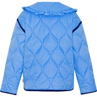 Quiltet, blå jakke med pink inderside, bred, aftagelig flæsekrave, mørkeblå kantebånd og knaplukning. Der er anvendt en vand- og smudsafvisende coating uden brug af kemikalier som PFOS, PFOA og lignende.