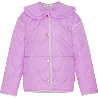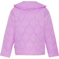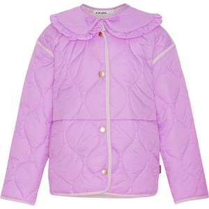 Quiltet, lilla jakke med lys inderside, bred, aftagelig flæsekrave, lyserøde kantebånd og knaplukning. Der er anvendt en vand- og smudsafvisende coating uden brug af kemikalier som PFOS, PFOA og lignende.