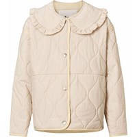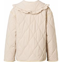 Beige vind- og vandafvisende vatteret jakke i blød bomuld med bølget quiltet mønster og matchende kantbånd. Jakken har trykknapper foran og en fastsyet krave med fine flæsedetaljer. En let og lun jakke med et elegant udtryk.