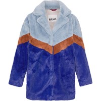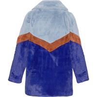 Frakke i blød faux-fur med krave, trykknapper og to sidelommer. Pelsen er blokfarvet i mørkeblå for oven, lyseblå forneden og en brun stribe over brystet.