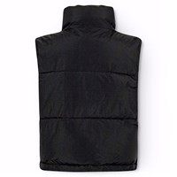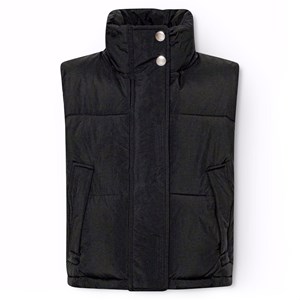 Vatteret sort vest i genanvendt nylon. Vesten har en opretstående krave, lynlås med overfald samt store ærmegab, som gør det muligt at have en jakke eller en tyk trøje inden under. Vesten har lommer fortil og en en indevendig justerbar elastik i bunden. Den vandafvisende overflade er fri for PFOS og PFOA.