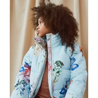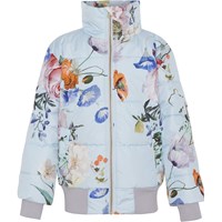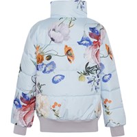 Halle er en lyseblå bomber jakke med blomster print. Jakken har elastisk rib for enden af ærmerne og i bunden af jakken. Halle er foret med teknisk dun, kaldet pearl padding, som giver ekstra blødhed, holder godt på varmen og har en dunlignende følelse. Dette produkt har en vandafvisende PFC-fri imprægnering (indeholder f.eks. ikke PFOS, PFOA og lignende). Vandsøjletryk: 5.000 mm. Åndbarhed: 5.000 g/m2/24t.