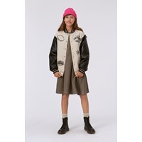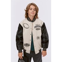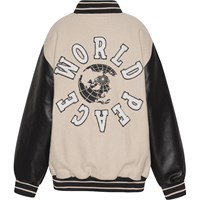 Baseball jakke i beige med sorte ærmer og broderi på både front og bagside. Jakken har knappelukning på fronten, samt stribede ribkanter ved hals, ærmeafslutning og bund i sort.