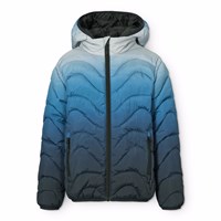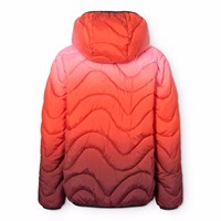 Vandafvisende vatteret jakke i genanvendt polyester i røde og lyserøde gradientfarver. Jakken har en aftagelig hætte, opretstående krave, lynlås med hagebeskytter og lynlåslommer på fronten.
