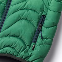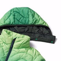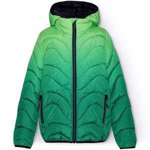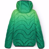 Vandafvisende dynejakke i grøn gradientfarver, som begynder med en lysegrøn nuance ved hætten og gradvist bliver dybere og mørkere grøn ned mod bunden. Jakken har en aftagelig hætte, opretstående krave, lynlås med hagebeskytter og lynlåslommer på fronten. Jakke og vattering er i genanvendt polyester. Den vandafvisende overflade er fri for PFOS og PFOA.