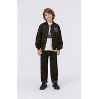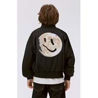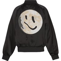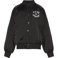 Sort bomber jakke med stort broderet måne på bagsiden og teksten 'over the moon' på forsiden af brystet. Bomberjakken har ribkant ved både hals, håndled og hofte. Jakken har trykknapper på fronten og Lommer i siderne.
