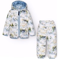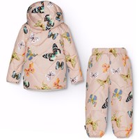 Vandafvisende blødt og lyst termosæt til de mindste, med pudder farvet foer og kantbånd. Jakken har en aftagelig hætte, opretstående krave, lynlås med hagebeskytter og en enkelt lomme på fronten. Bukserne har en elastisk talje med en indvendig justerbar elastik. Sættet har et allover print af sommerfugle i alverdens farver og mønstre Jakke, bukser og vattering er i genanvendt polyester. Den vandafvisende overflade er fri for PFOS og PFOA.