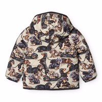 Vandafvisende quiltet jakke i genanvendt polyester til de mindste, med lyst foer, brune kanter og print af hunde i brune nuancer. Jakken har en aftagelig hætte, opretstående krave, lynlås med hagebeskytter og en enkelt lomme på fronten. Ydemere har jakken et genanvendt polyesterfyld, der giver jævn blødhed og optimal varmeisolering samt den vandafvisende overflade er fri for PFOS og PFOA.