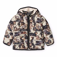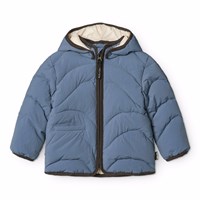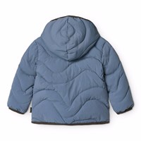 Vandafvisende blå quiltet jakke i genanvendt nylon til de mindste, med lyst foer og brune kanter. Jakken har en aftagelig hætte, opretstående krave, lynlås med hagebeskytter og en enkelt lomme på fronten. Ydemere har jakken et genanvendt polyesterfyld, der giver jævn blødhed og optimal varmeisolering samt den vandafvisende overflade er fri for PFOS og PFOA.