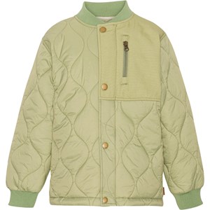 Quiltet, vandafvisende jakke i lysegrøn med dekorative canvas paneler på det ene bryst og den øverste del af ryggen. Jakken har brystlomme, diskrete sidelommer, ribkant ved hals og håndled samt skjult lynlås, der er dækket af en vindstolpe med praktiske trykknapper. Der er anvendt en vand- og smudsafvisende coating uden brug af kemikalier som PFOS, PFOA og lignende.