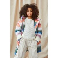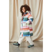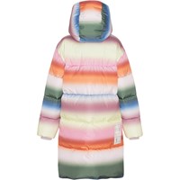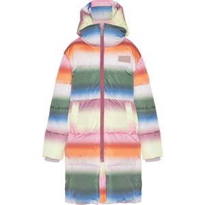 Harper er en dejlig varm og lang frakke i pastelfarvet regnbue print. Jakken har hætte, lommer med lynlås på fronten, samt refleks på bagsiden. Harper er foret med teknisk dun, kaldet pearl padding, som giver ekstra blødhed, holder godt på varmen og har en dunlignende følelse. Dette produkt har en vandafvisende PFC-fri imprægnering (indeholder f.eks. ikke PFOS, PFOA og lignende). Vandsøjletryk: 5.000 mm. Åndbarhed: 5.000 g/m2/24t.