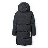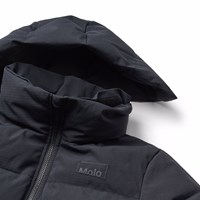Vind- og vandafvisende sort jakke i genanvendt nylon med praktisk lynlåslukning, høj krave og aftagelig hætte. Jakken har en længde til over knæet og er designet med frontlommer, en indvendig lomme samt ribkant ved håndleddene. Høje slidser med trykknapper i begge sider sikrer stor bevægelsesfrihed og gør jakken praktisk når du skal cykle. En stor refleks bagpå øger synligheden i trafikken. Jakken er foret med blødt, genanvendt polyesterfyld for jævn komfort og optimal varmeisolering.