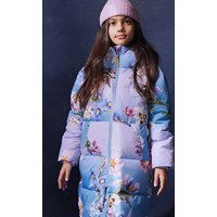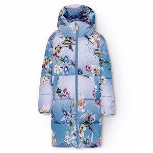 varm dynejakke til en kold vinter i genanvendt polyester, med et print af smukke blomster i friske farver på en blå og lilla baggrund. Jakken går til over knæet, har en aftagelig hætte, lommer i siden samt ærmerne er udstyret med ribkanter, der effektivt holder vind, sne og regn ude og samtidig sikrer, at vanterne forbliver på plads. Jakken er udstyret med høje slidser på begge sider, som kan lukkes med trykknapper, det sikrer en stor bevægelsesfrihed, samt gør det nemt at cykle i jakken. Jakken har en stor refleks bagpå, for større synlighed i trafikken.