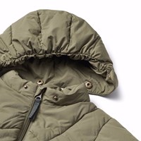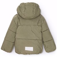 Vandafvisende olivengrøn jakke til de mindste i genanvendt nylon. Jakken har en aftagelig hætte, lynlås og lommer på fronten samt en elastik ved ærmeåbning samt i bunden, som hjælper dit barn med at holde på varmen.
