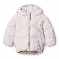 Råhvid vandafvisende jakke til de mindste i genanvendt polyester med at print af farverige dyr fra gamle tegnefilm. Jakken har en aftagelig hætte, lynlås på fronten, forede lommer samt elastik ved håndleddene og i bunden, der hjælper med at holde på varmen. Ydemere har jakken et genanvendt polyesterfyld, der giver jævn blødhed og optimal varmeisolering samt den vandafvisende overflade er fri for PFOS og PFOA.
