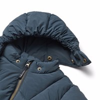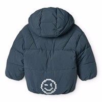 Vandafvisende mørkeblå jakke til de mindste i genanvendt nylon. Jakken har en aftagelig hætte, lynlås på fronten, forede lommer samt elastik ved håndleddene og i bunden, der hjælper med at holde på varmen. Ydemere har jakken et genanvendt polyesterfyld, der giver jævn blødhed og optimal varmeisolering samt den vandafvisende overflade er fri for PFOS og PFOA.