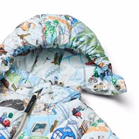 Vandafvisende jakke til de mindste i genanvendt polyester med et pixeleret print af den virkelige verden, sjove figurer fra Molo's kollektioner samt en masse spændende historier, der er sjove at studere i det farverige univers. Jakken har en aftagelig hætte, lynlås på fronten, forede lommer samt elastik ved håndleddene og i bunden, der hjælper med at holde på varmen. Ydemere har jakken et genanvendt polyesterfyld, der giver jævn blødhed og optimal varmeisolering samt den vandafvisende overflade er fri for PFOS og PFOA.