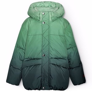 Vandafvisende jakke i genanvendt polyester i grønne gradient farver. Jakken har en aftagelig hætte, lynlås med overfald, der holder sne, vind og vand ude. Jakken har lommer fortil samt en justerbar elastik i bunden, som holder vind ude samt holder bedre på varmen.