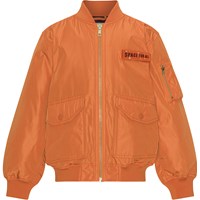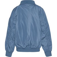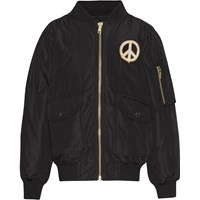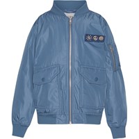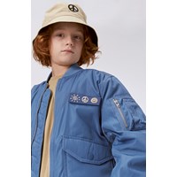 Blå bomber jakke med aftagelig patch på fronten med sol, peace og smiley. Bomberjakken har ribkant ved både hals, håndled og hofte. Jakken har lommer med trykknapper og en ekstra lomme med lynlås på venstre arm.