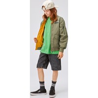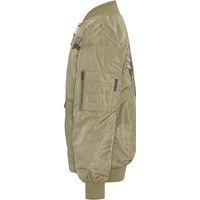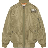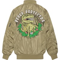 Heath er en grøn bomber jakke med flot broderi på ryggen af en dinosaur og teksten "Peace Protector". Jakken har ribkant ved både hals, håndled og hofte. Heath har lommer med trykknapper og en ekstra lomme med lynlås på venstre arm.