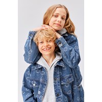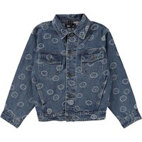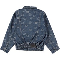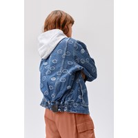 Hedly er en blå denimjakke med mange forskellige emojier. Jakken har brystlommer med kanppelukning, samt lommer i siderne og elastik i bunden af ryggen, som giver jakken en cool pasform.