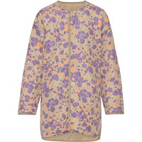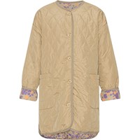 Hedvig er en quiltet frakke i beige med knappe lukning på fronten. Frakken kan vendes om så indersiden af frakken, som har print af grafiske prikker, bliver synlig. På den måde får man to frakker i én.