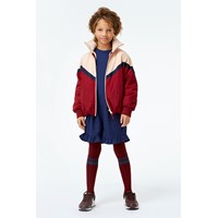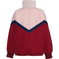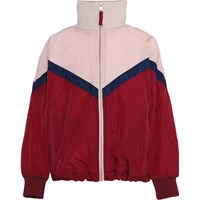 Helga er en tre farvet bomberjakke med lyserød top, mørkerød bund og mørkeblå stribe imellem. Jakken har lynlåslukning og høj krave og ærmeafslutninger i rib.
