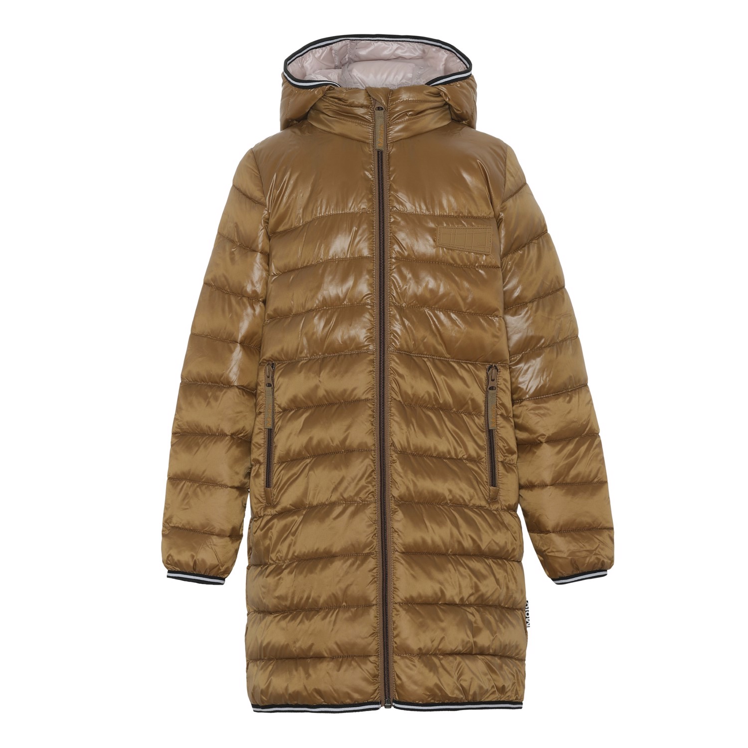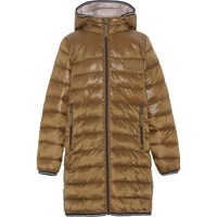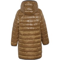 Helin er en lang frakke i brun med aftagelig hætte. Jakken har lynlås lukning og lynlås lommer på fronten. Jakken er foret med recycled peral padding, som har en dunlignende følelse med ekstra blødhed og som holder godt på varmen.