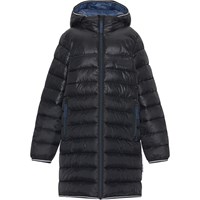 Let, vandafvisende dynefrakke i sort med lynlås ned langs fronten, aftagelig hætte og lynlåslommer i begge sider. Frakken har blå detaljer på lynlåsene og stribet kantebånd ved ærmerne og i bunden. Den er foret med imiteret dunfyld kaldet Pearl Padding, som giver en ensartet blødhed, holder godt på varmen og gør vask nemmere. Der er anvendt en vand- og smudsafvisende coating uden brug af kemikalier som PFOS, PFOA og lignende.