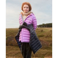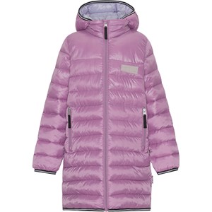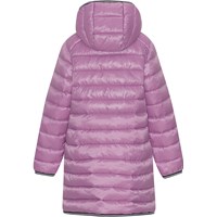 Let, vandafvisende dynefrakke i pink med lynlås ned langs fronten, aftagelig hætte, lynlåslommer i begge sider og stribet kantebånd ved ærmerne og i bunden. Den er foret med imiteret dunfyld kaldet Pearl Padding, som giver en ensartet blødhed, holder godt på varmen og gør vask nemmere. Der er anvendt en vand- og smudsafvisende coating uden brug af kemikalier som PFOS, PFOA og lignende.