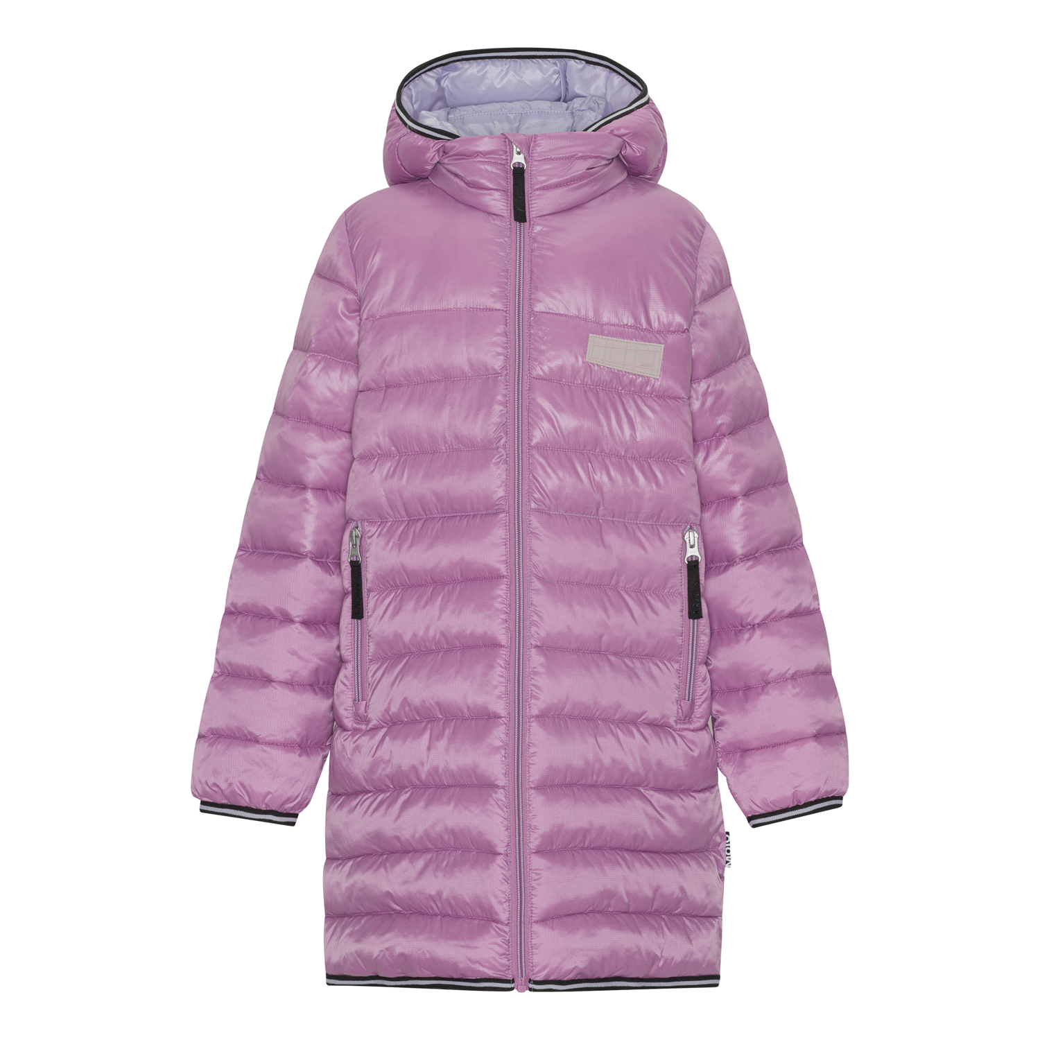 Let, vandafvisende dynefrakke i pink med lynlås ned langs fronten, aftagelig hætte, lynlåslommer i begge sider og stribet kantebånd ved ærmerne og i bunden. Den er foret med imiteret dunfyld kaldet Pearl Padding, som giver en ensartet blødhed, holder godt på varmen og gør vask nemmere. Der er anvendt en vand- og smudsafvisende coating uden brug af kemikalier som PFOS, PFOA og lignende.