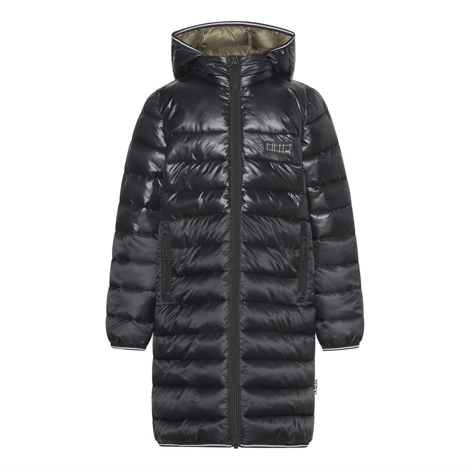 Helin er en sort lang frakke i sort med aftagelig hætte. Jakken har lynlås lukning og lynlås lommer på fronten. Jakken er foret med peral padding, som har en dunlignende følelse med ekstra blødhed og som holder godt på varmen.