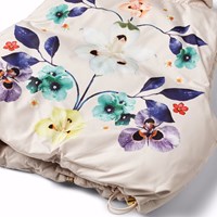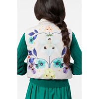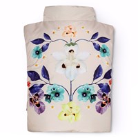 Pudderfarvet vatteret vest i genanvendt polyester med et smukt blomsterprint på ryggen. Vesten har en opretstående krave, lynlås med overfald samt store ærmegab, som gør det muligt at have en jakke eller en tyk trøje inden under. Vesten har lommer fortil og en en indevendig justerbar elastik i bunden. Den vandafvisende overflade er fri for PFOS og PFOA.