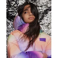 Varm dynejakke til en kold vinter i genanvendt polyester, med et multifarvet vævende grafitti print. Jakken har en aftagelig hætte, lommer i siden samt ærmerne er udstyret med ribkanter, der effektivt holder vind, sne og regn ude og samtidig sikrer, at vanterne forbliver på plads. Jakken har en stor refleks bagpå, for større synlighed i trafikken.