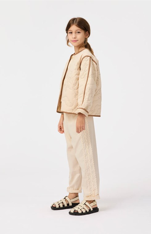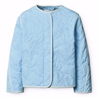 Blå vandafvisende termojakke i genanvendt nylon med quiltet mønster af heste. Jakken har en almindelig pasform, lynlås med vindstolpe samt matchende kantbånd hvilket giver en flot finish.