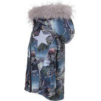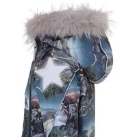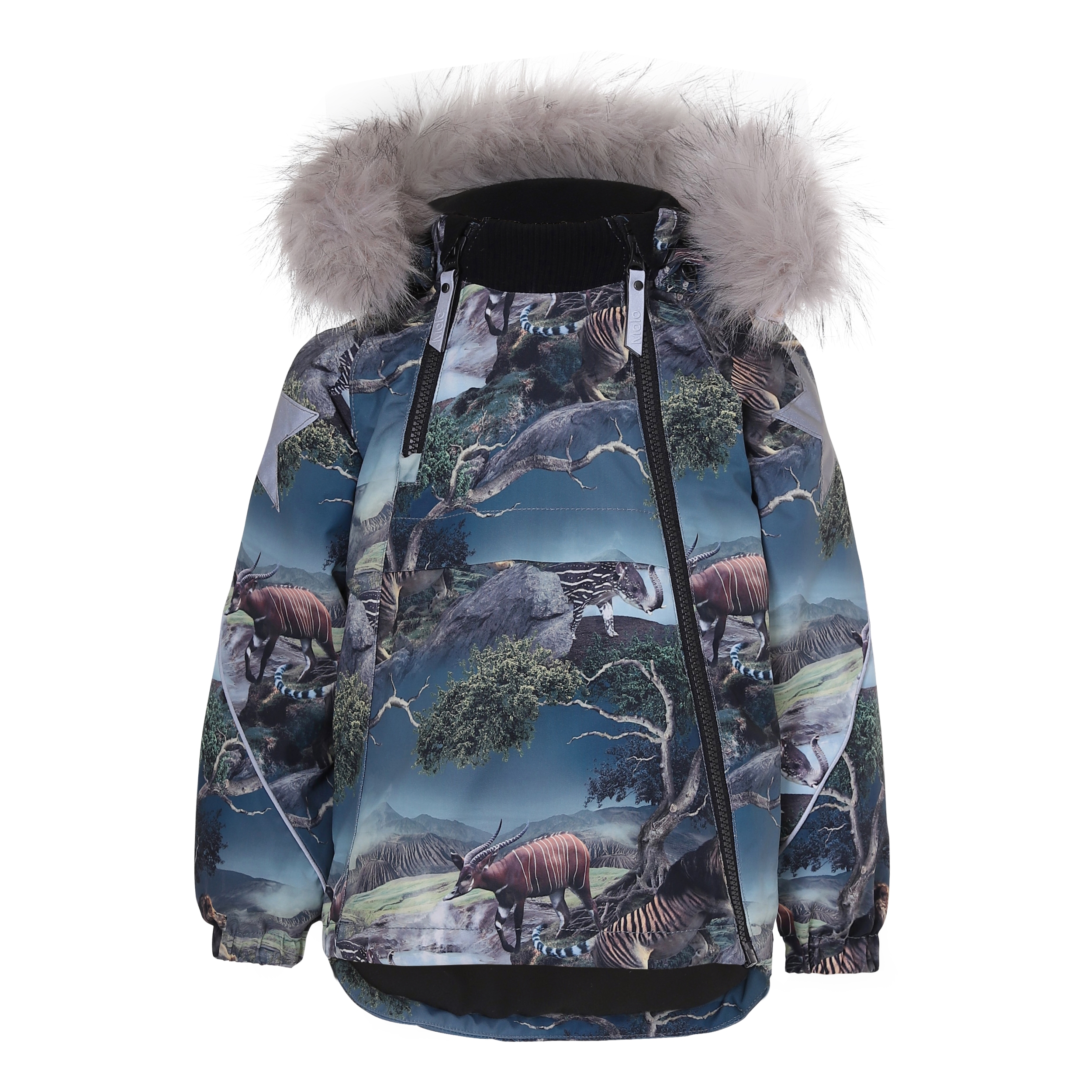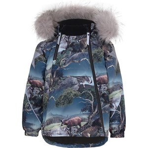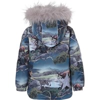 Hopla Fur er en funktionel og vandtæt vinterjakke i blå med print af fremtidens dyr. Jakken har aftagelig hætte med faux fur pelskant (som også kan tages af), skrå lynlåse ned langs fronten, rib ved hals, elastik ved ærmeafslutninger samt Molo's velkendte refleksstjerne på begge overarme og nederst på jakken bagpå. Jakken er lavet i et vindtæt, vandtæt og åndbart materiale, har 3M™ Thinsulate™ isolering, højkvalitetsfleece på udsatte områder og tapede sømme. Dette produkt har en vandafvisende PFC-fri imprægnering (indeholder f.eks. ikke PFOS, PFOA og lignende). Vandsøjletrykket og åndbarheden er yderligere forbedret og er nu helt oppe på 15.000 mm i vandsøjletryk og åndbarhed på 15.000 g/m2/24t.